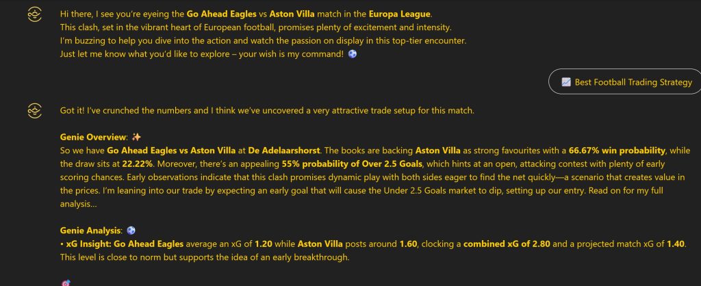 For example, if Genie suggests a goal positive strategy but by half time I can see the xG is dead, then I exit. The Genie has given me good data based on the pre-match but it is now my responsibility as a trader to follow the live data and make a decision.